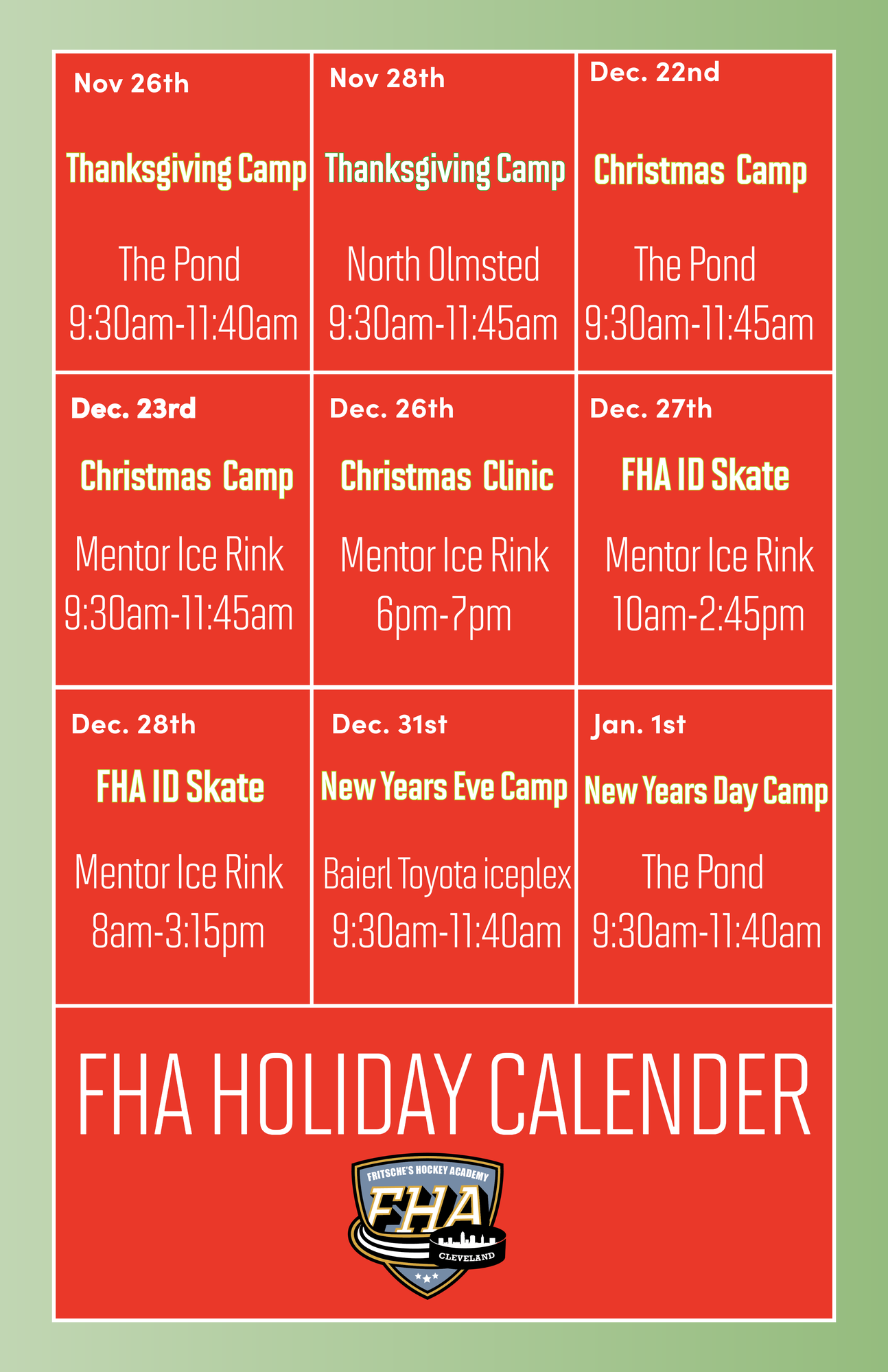 Stay on the ice with FHA during our Holiday's by joining one of our many clinics throughout the holidays. All of our 2 hour clinics will be 1 hour of skills followed by 1 hour of cross ice 3v3.