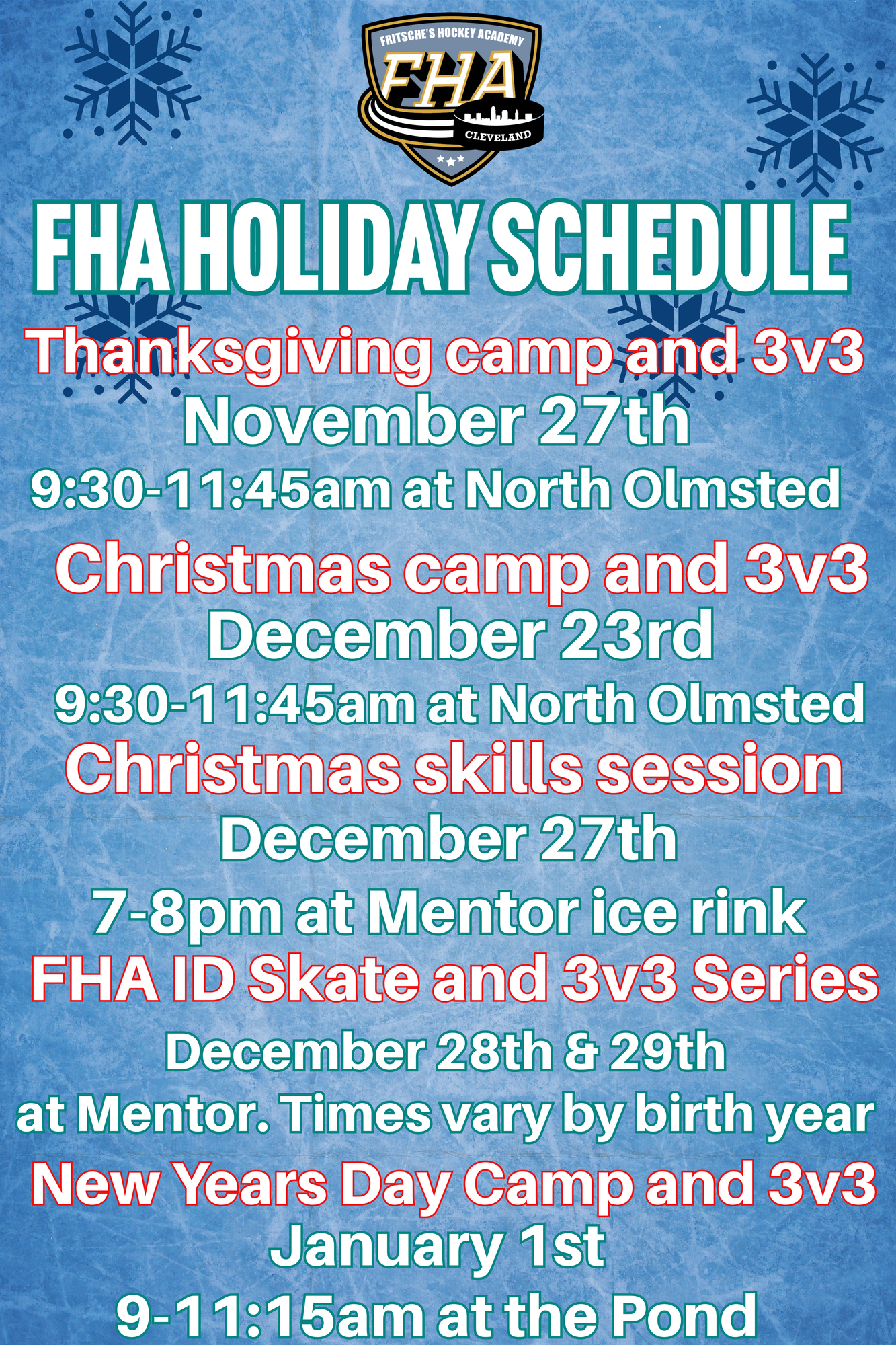 Thanksgiving camp, Christmas camp, FHA ID skate and New Years Camp.